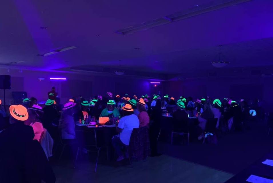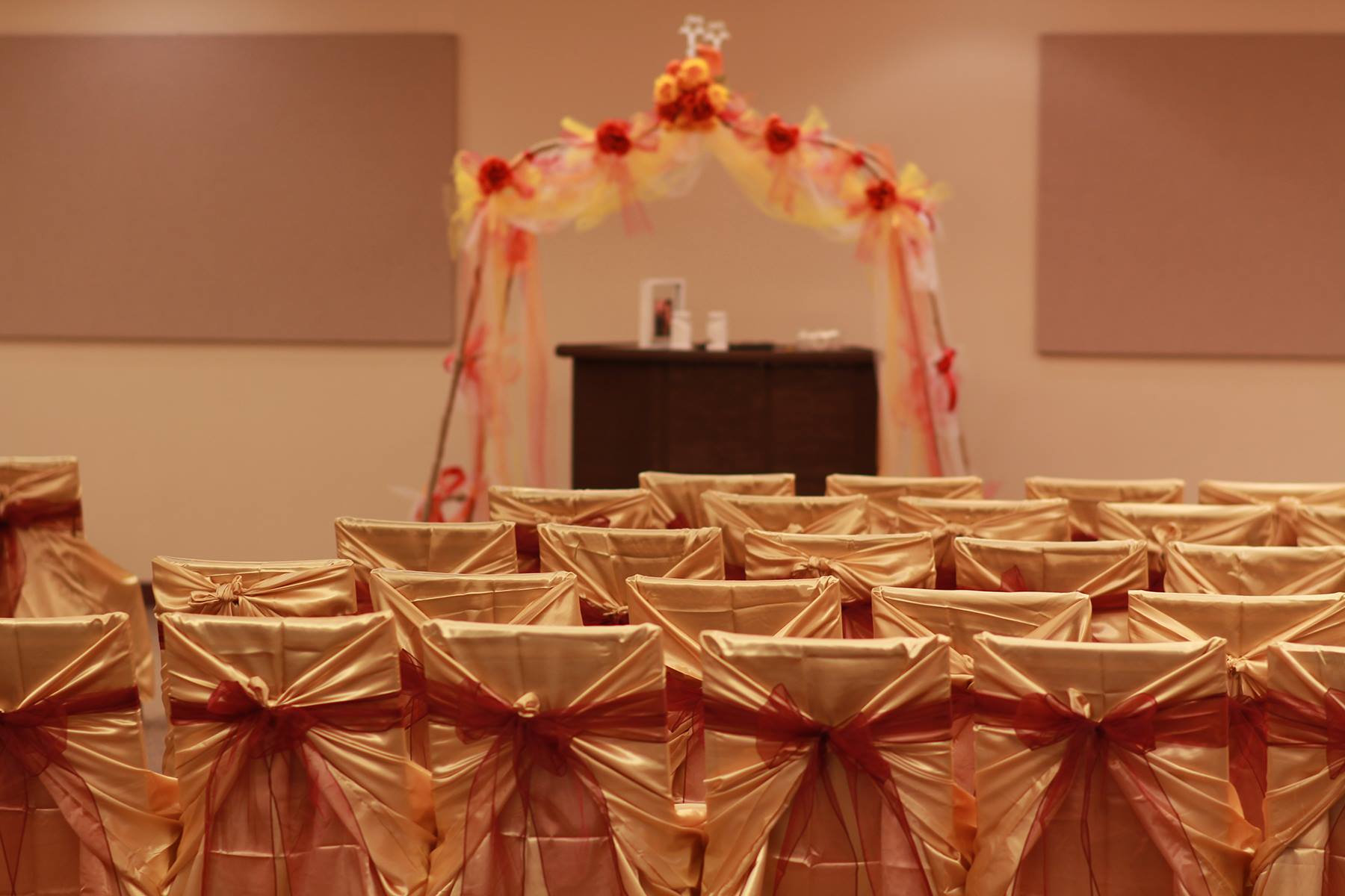 The facility features a 115′ x 53′ banquet room, a large oak dance floor, two projector screens, fourteen 4′ x 8′ panels throughout the room for decorating, fully-equipped caterers kitchen, and restrooms. Included in your rental fee are round tables (49″ round x 33″ tall) for your guests, 6′ and 8′ tables for your head table and food tables, and black vinyl chairs (18″ wide, 16″ seat, 33″ tall).