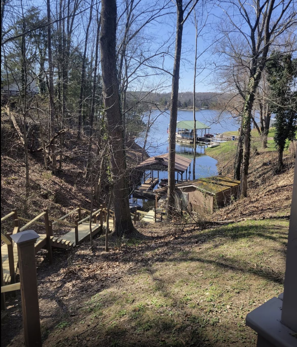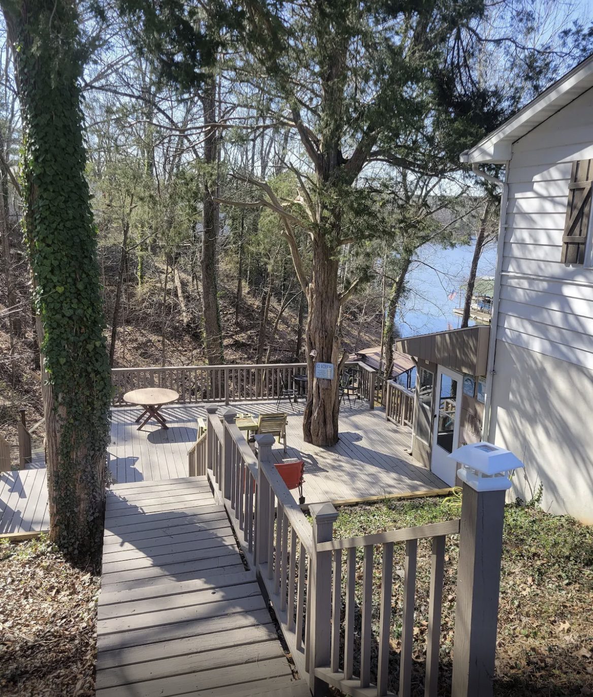 Stairway to the dock – Guests can enjoy the screened-in porch with lake views as well as the large shaded deck that features a stairway leading straight to the boat dock!