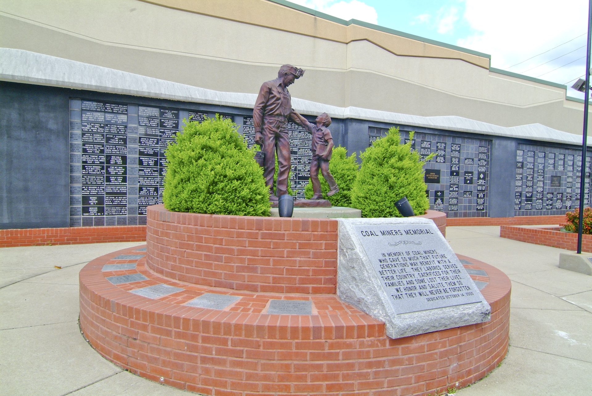 The center statue of the Coal Miners Memorial depicts a miner returning home from his shift of work being greeted by his son, on top of a circular brick bench.