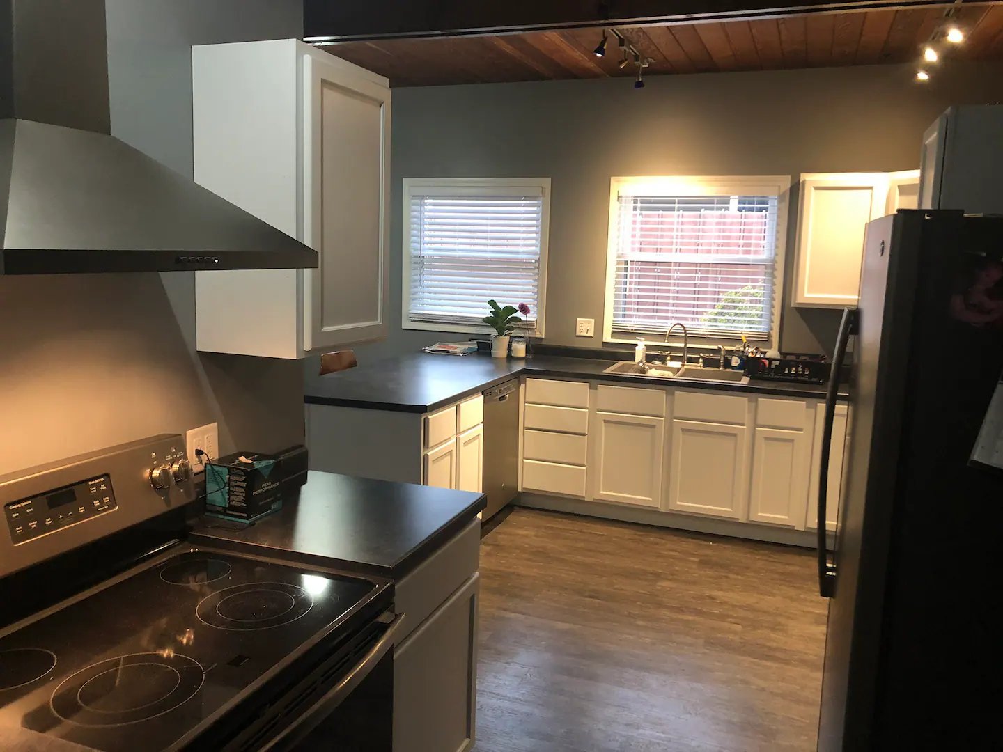 Courtyard view, kitchen, dedicated workspace, WiFi, 65`` HDTV with Roku, and a washer/dryer. Security cameras are also on property.
