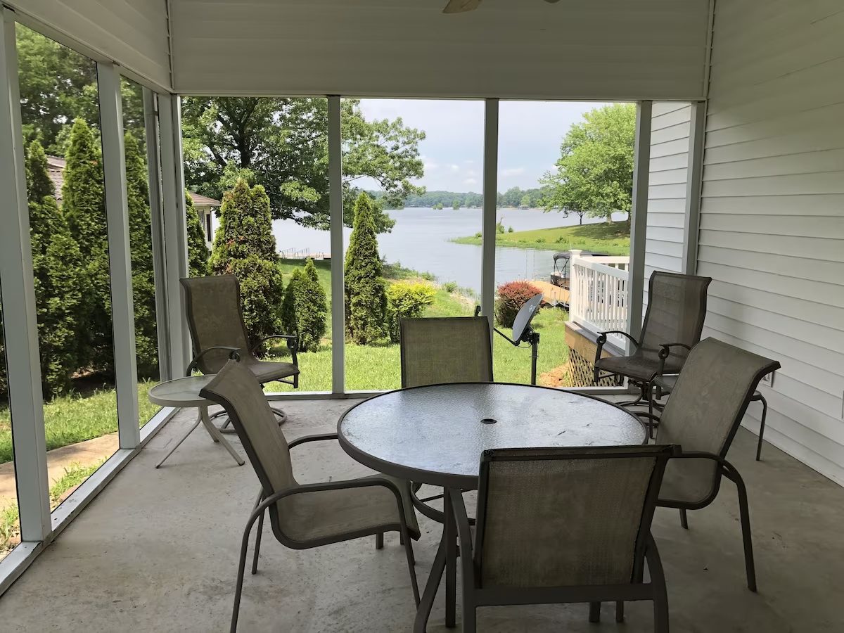 3 bedrooms with 1 king bed (master), 1 queen bed (2nd bedroom), 2 queen beds (brand new 3rd bedroom), 2 pull out queen sleeper sofas (family room), 1.5 baths, Beautiful great room with screened in back porch, Dock with electricity, Beautiful Lake Views facing the main lake channel, Fire Pit, Wifi, Outdoor Grill, garage, Washer/Dryer, Flat Screen TV's/DVD player.