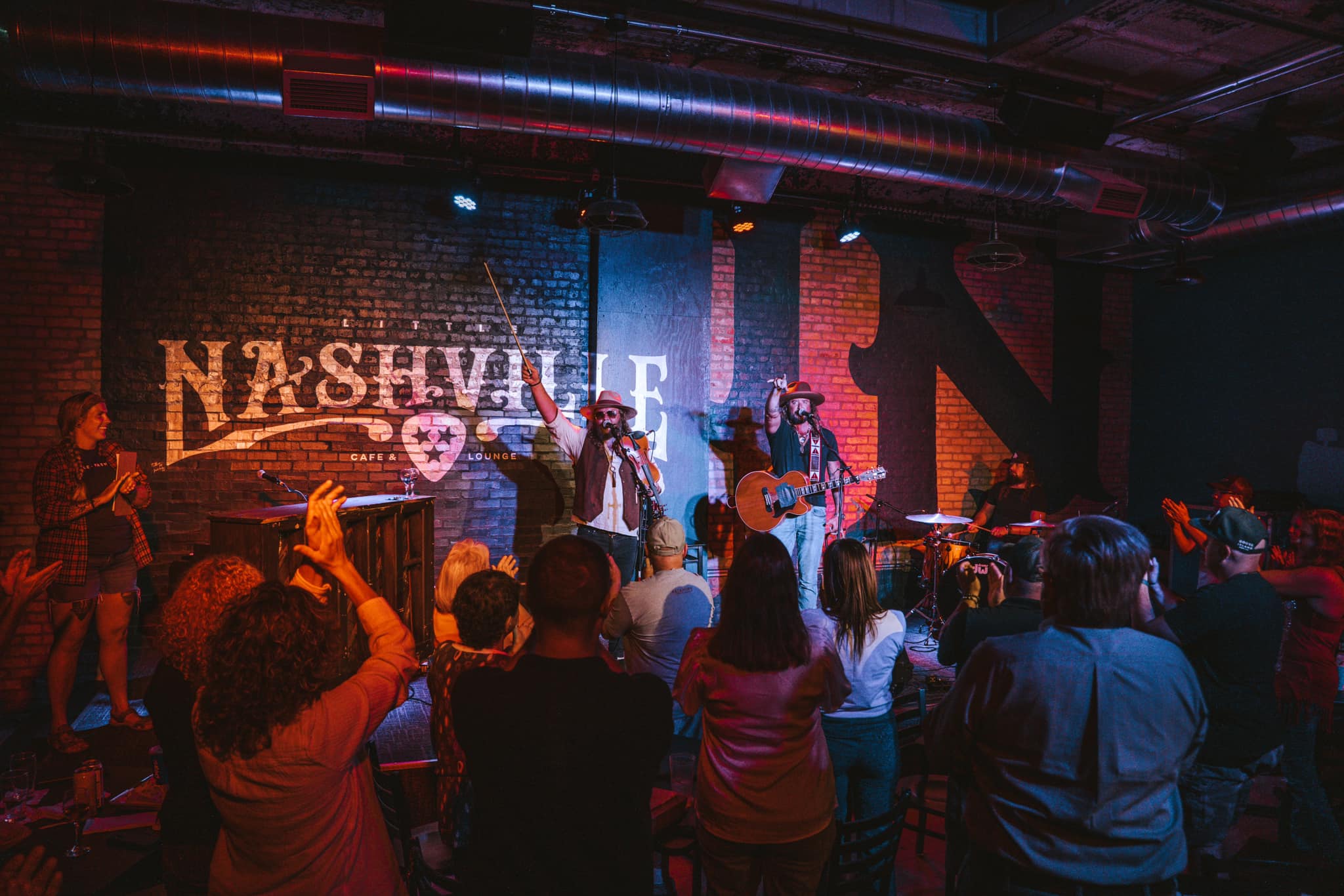 Little Nashville features 14 bar seats, 20 4-top tables, 5 6-top tables, 2 sofas, 4 lounge chairs, and a performance stage.