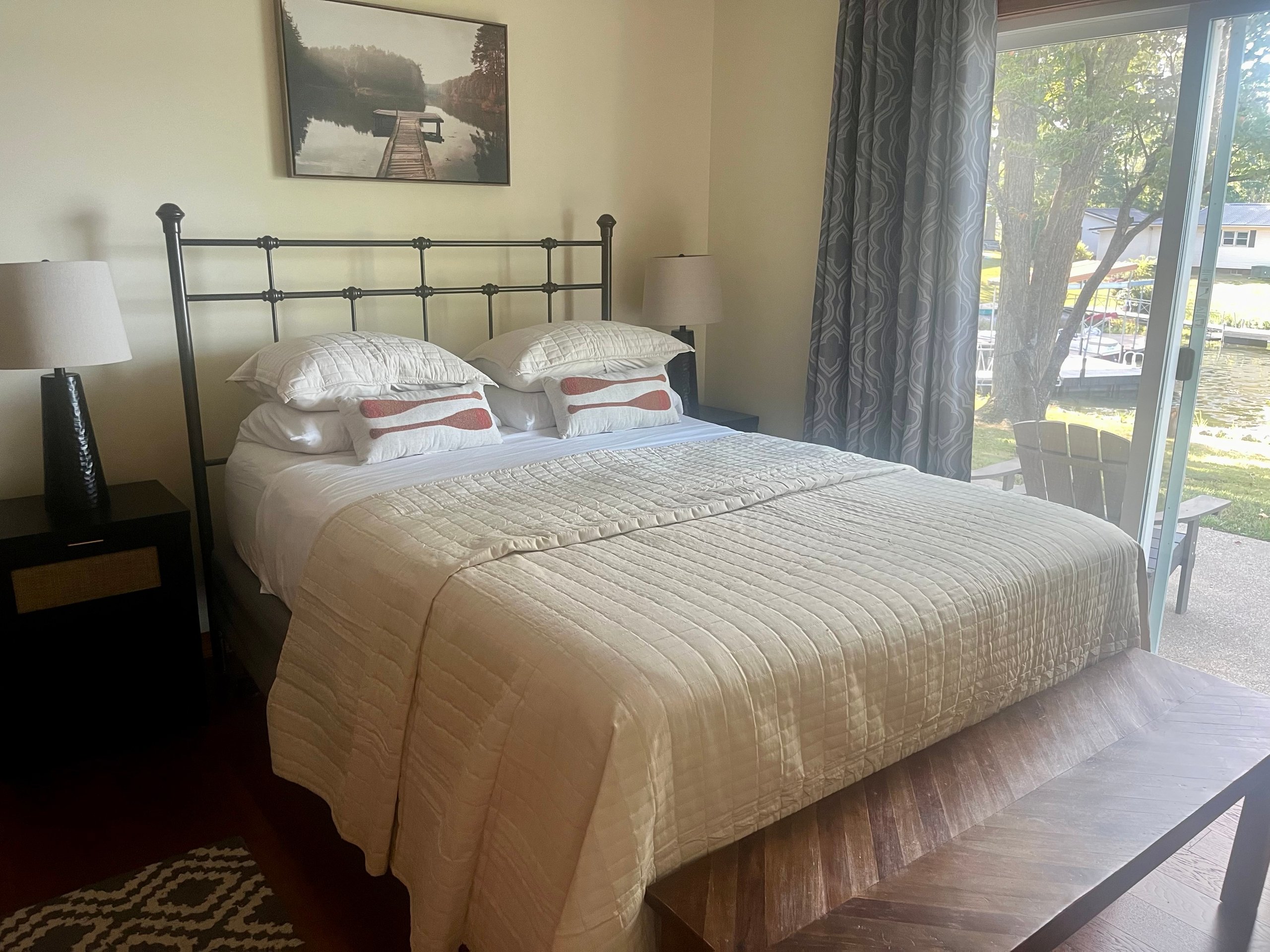 The main level features an open floor plan with a Living Room, newly remodeled Kitchen, Dining Room, and half Bath. The upper deck is off the Kitchen / Dining Room. Lower level features large Master Bedroom with seating area. Master Bath located off the Bedroom features a large shower and a garden tub. Two additional queen bedrooms and full bath are also on this level. All bedrooms have a walkout patio. All bathrooms have been recently remodeled. Washer and dryer (new June 2017) are located adjacent to bedrooms. All bedrooms feature arcadia doors with beautiful views of the lake.
