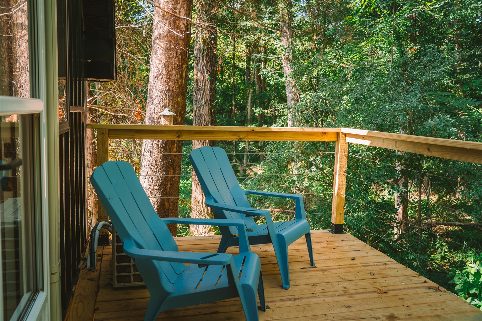 Open and airy treehouse with queen bed and sleeper sofa, full kitchen, and beautifully designed bathroom. This stay is located in a very quiet 7 acre wooded area outside of Marion, IL but only 9 minutes from downtown restaurants and shopping.