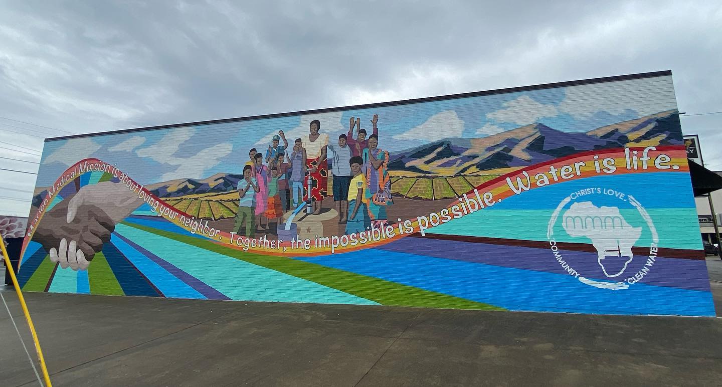 Learn More – The “Water is Life” mural for Marion Medical Mission is located along the north wall of Doug’s Lock&Key in Marion, IL.