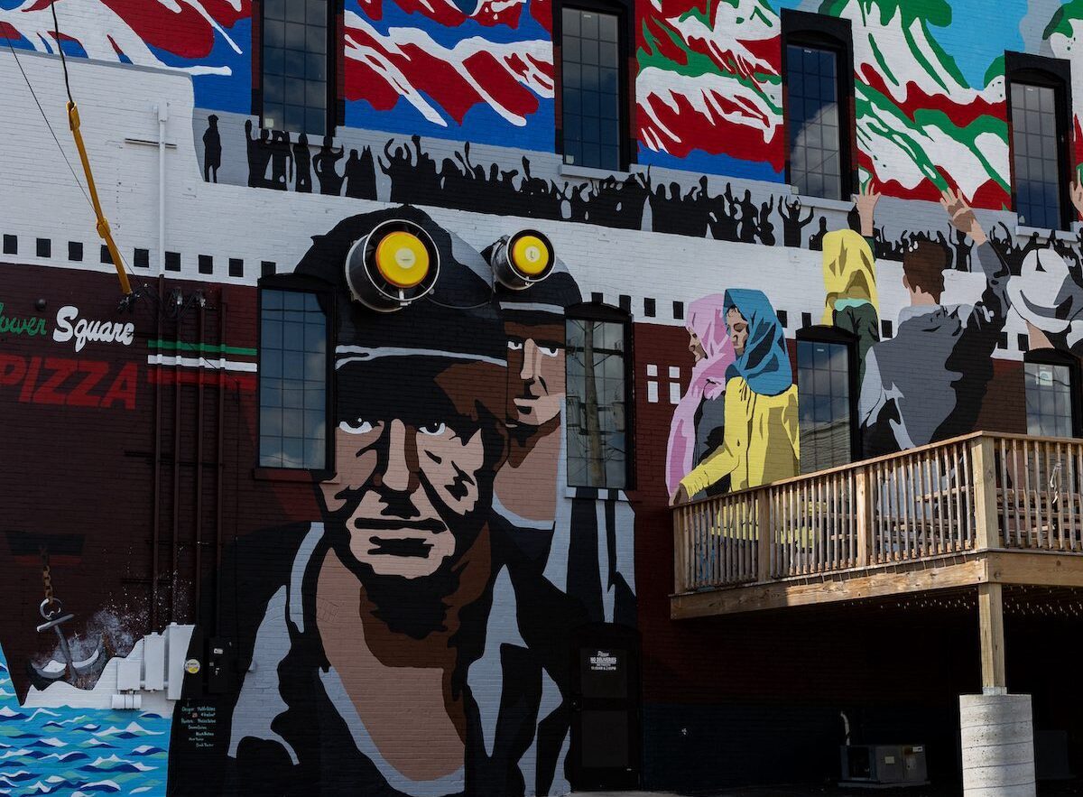 Welcome to America was designed by then 13 year old Maddie Dieters from Marion Illinois. The building-sized mural pays tribute to the Italian immigrants that left their homeland in search of a better life and ended up working in the southern Illinois coal mines. Painted by Maddie Deiters and her parents, Hank and Deanna in 2021.