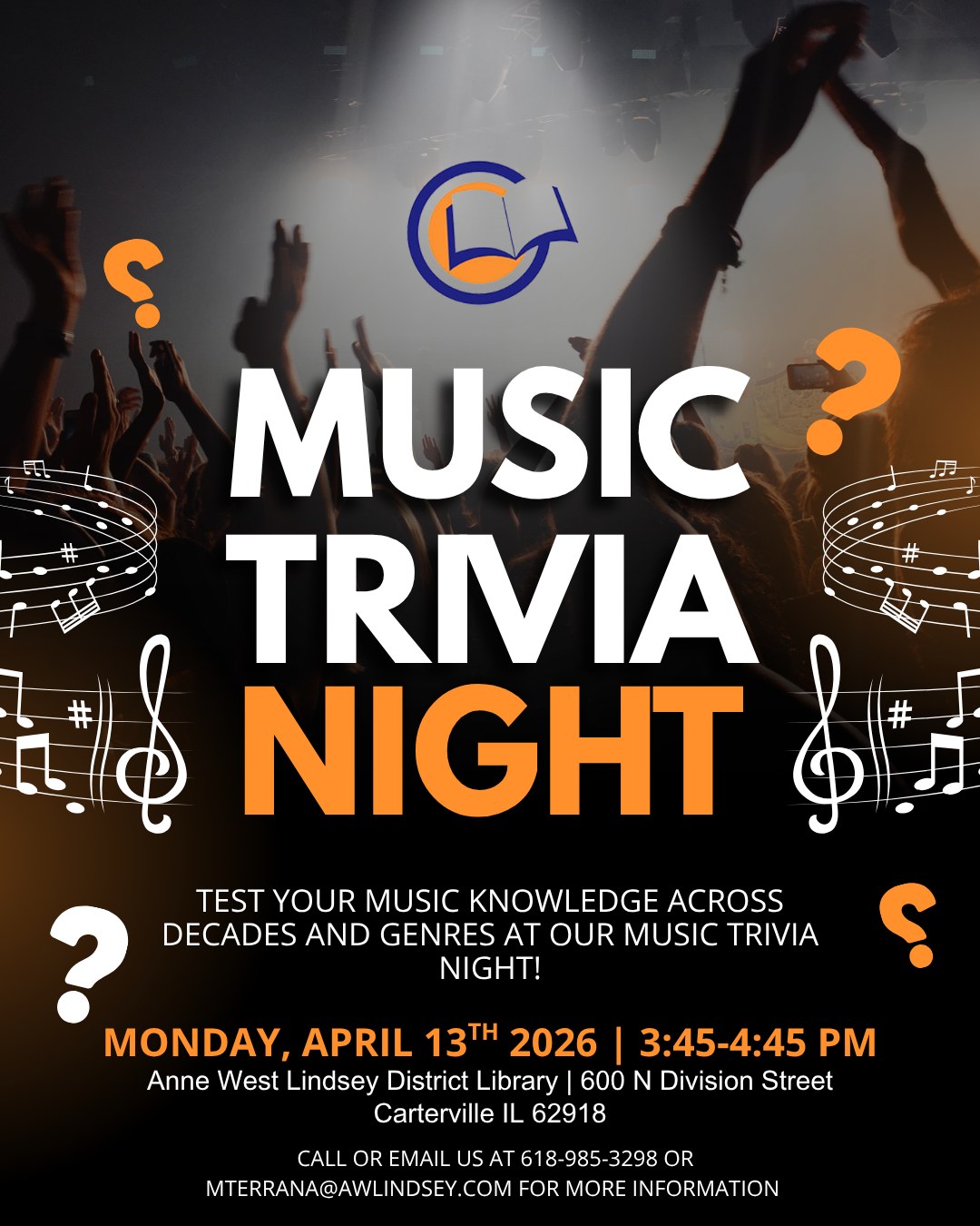 In need of some good music? Test your music knowledge across decades and genres at our Music Trivia Night! Join us on April 13th at 3:45 PM at the Anne West Lindsey District Library, 600 N Division St, Carterville, Illinois 62918.
