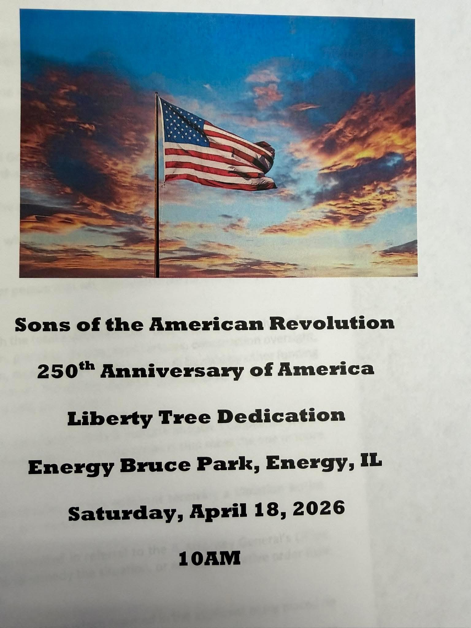 Join the Sons of the American Revolution for their 250th Anniversary of America Liberty Tree Dedication at Energy Bruce Park in Energy, IL 62933 on Saturday, April 18th 2026 at 10 AM.