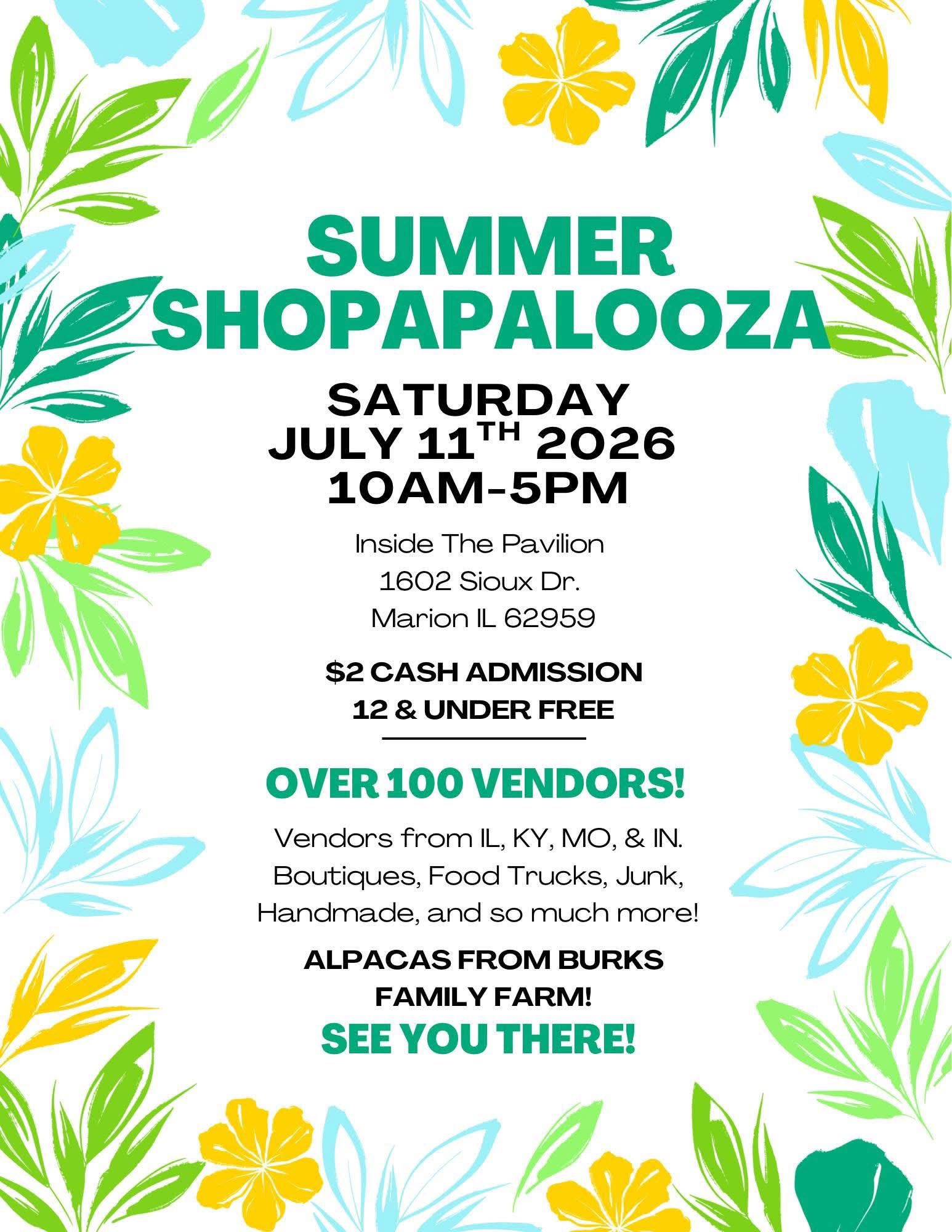 Grab your friends, bring the kids, and come shop ‘til you drop at Shopapalooza on Saturday, July 11th from 10 AM to 5 PM inside The Pavilion at 1602 Sioux Dr, Marion, IL 62959! Admission is $2 cash, 12 and