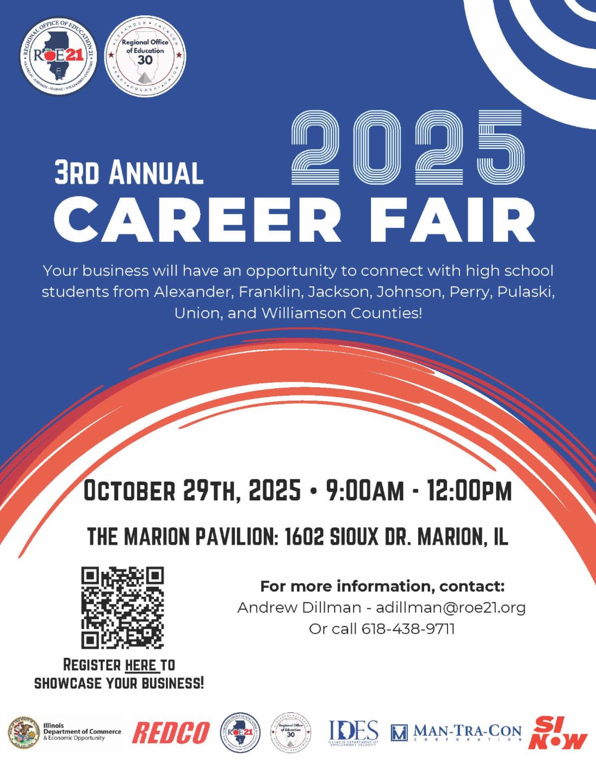 Join us for the 2025 Career Fair! October 29th 2025 from 9am-12pm Marion Pavilion: 1602 Sioux Dr. Marion, IL 62959 For more information, contact Andrew Dillman [email protected] or call 618-438-9711Â