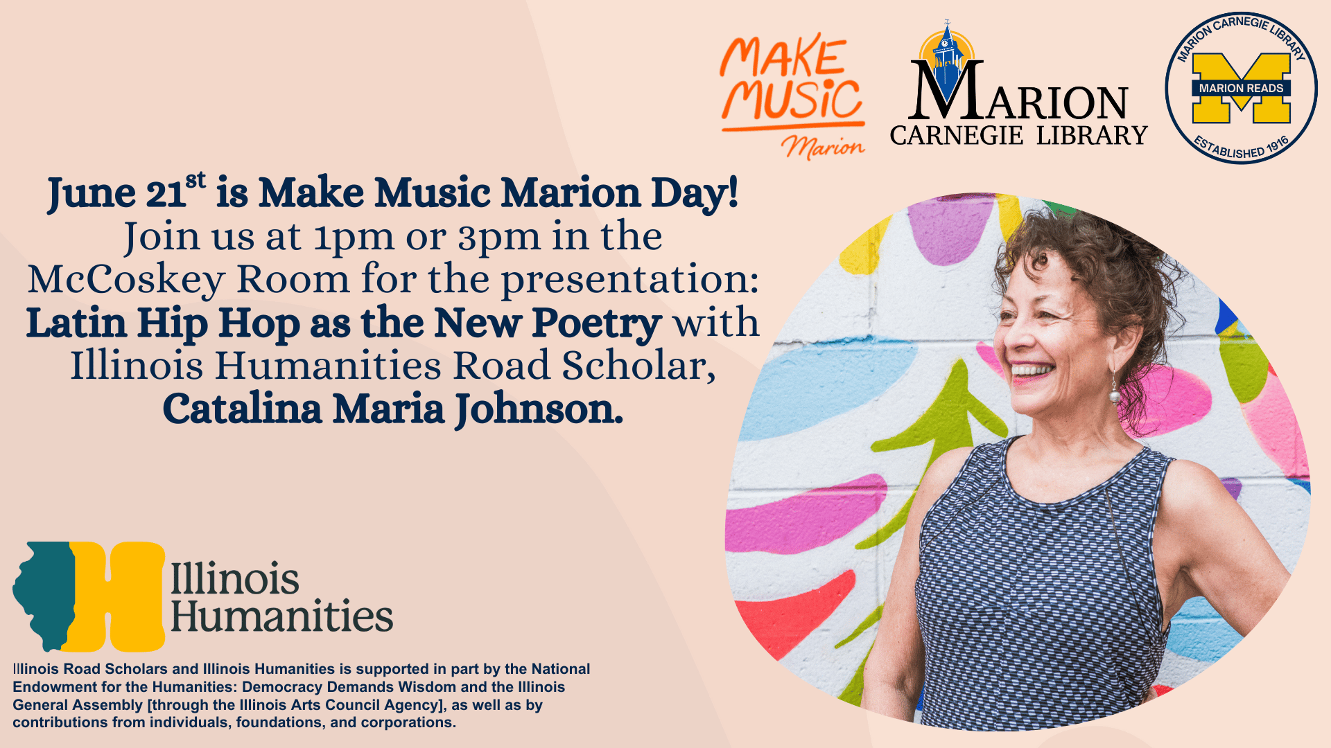This June, Marion Carnegie Library will host a presentation exploring the connections of spoken word and hip hop music. “We are excited to bring music journalist Catalina Maria Johnson to Marion,” said Kelly McMullen, Adult Services Coordinator. “Her presentation, Latin Hip Hop as