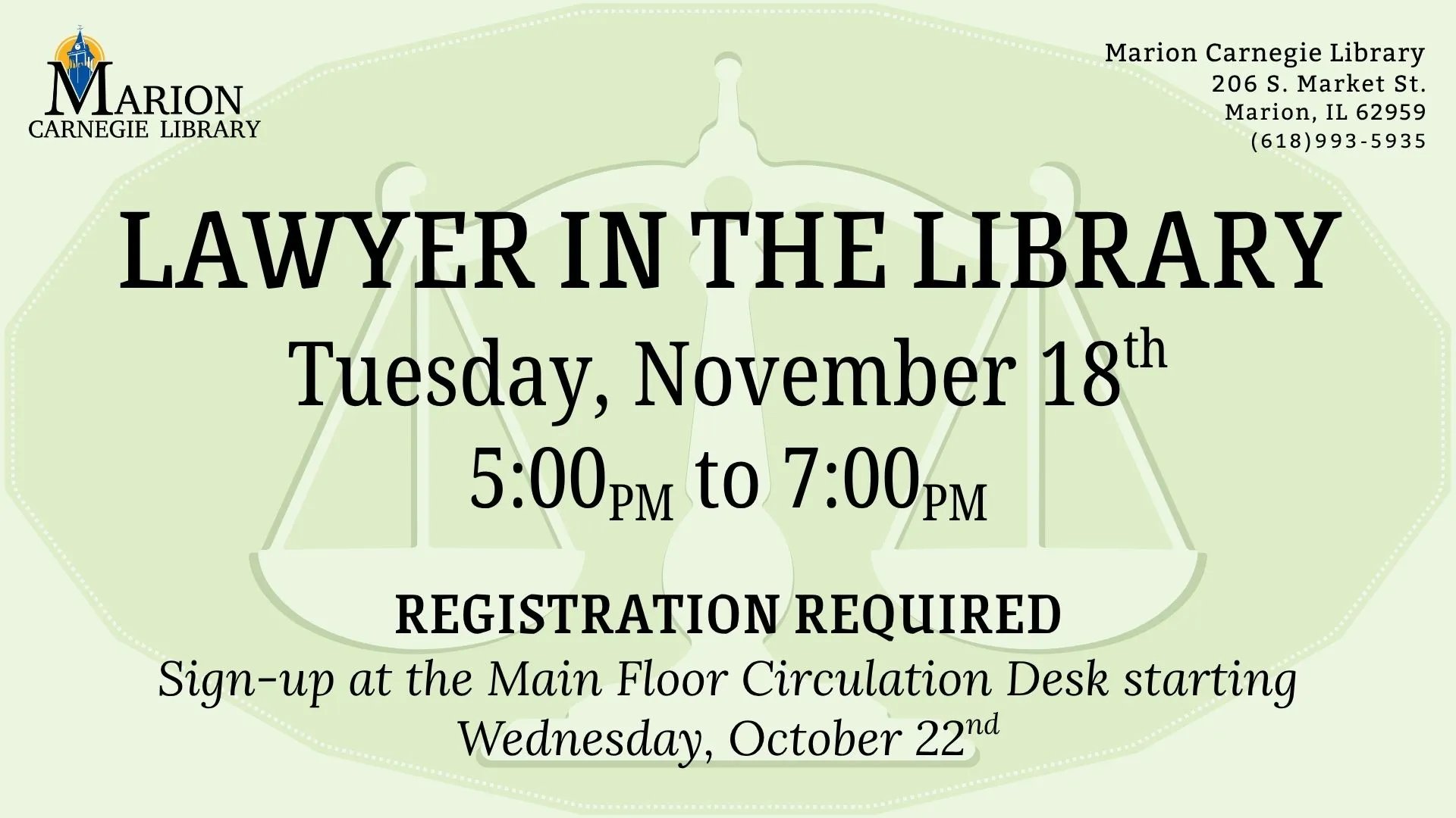 An attorney will be available for 20-minute, one-on-one meetings to assist with legal coaching, document review, referrals to additional community services, e-filing court documents, and legal questions. Registration required – see Main Circulation Desk to sign up.