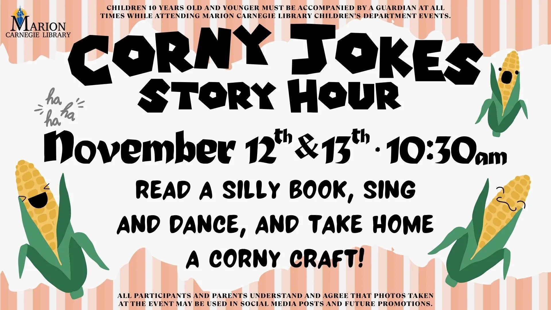 This is going to be a knee-slapping Story Hour! Read a silly book, sing and dance, and take home a corny craft!