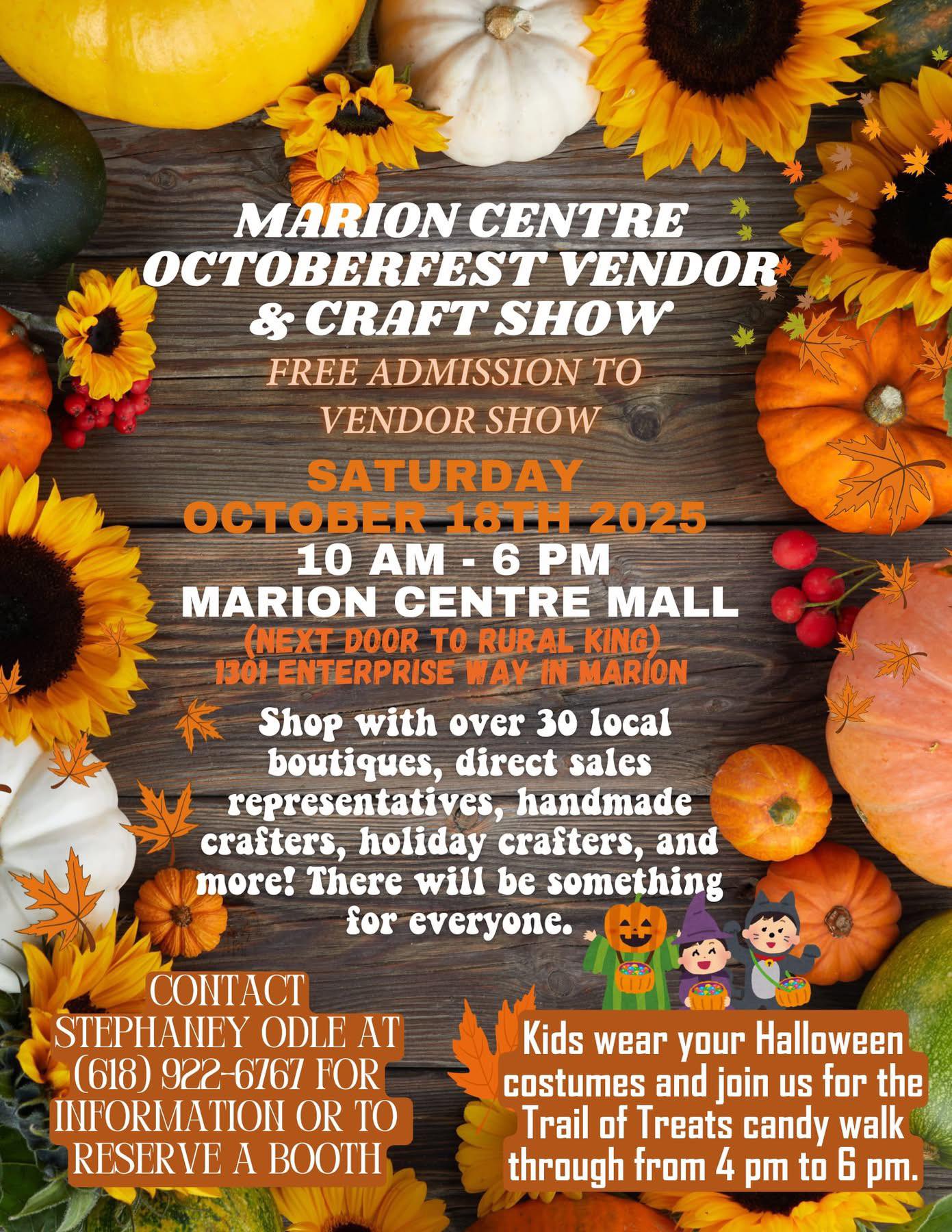 The Octoberfest Vendor & Craft Show 2025 will take place in Marion at the Marion Centre Mall (next to Rural King) from 10 am to 6 pm. The event will be held on Saturday, October 18, 2025 in conjunction with