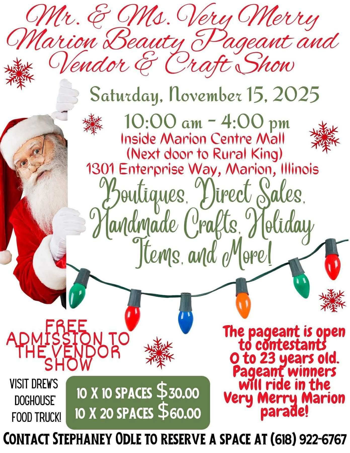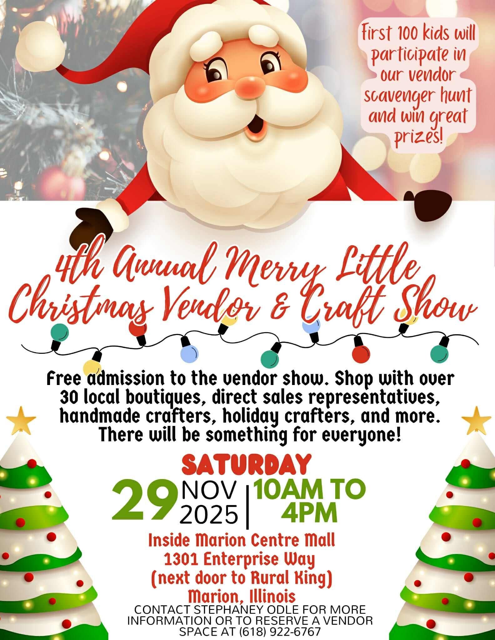 Marion Centre Mall (next to rural king) 1301 Enterprise Way, Marion, IL 62959 Saturday November 15th, 2025 10:00am-4:00pm Boutiques, Direct sales, Handmade Crafts, Holiday Items & More! Free Admission to the vendor show 10x10 spaces $30 10x20 spaces $60