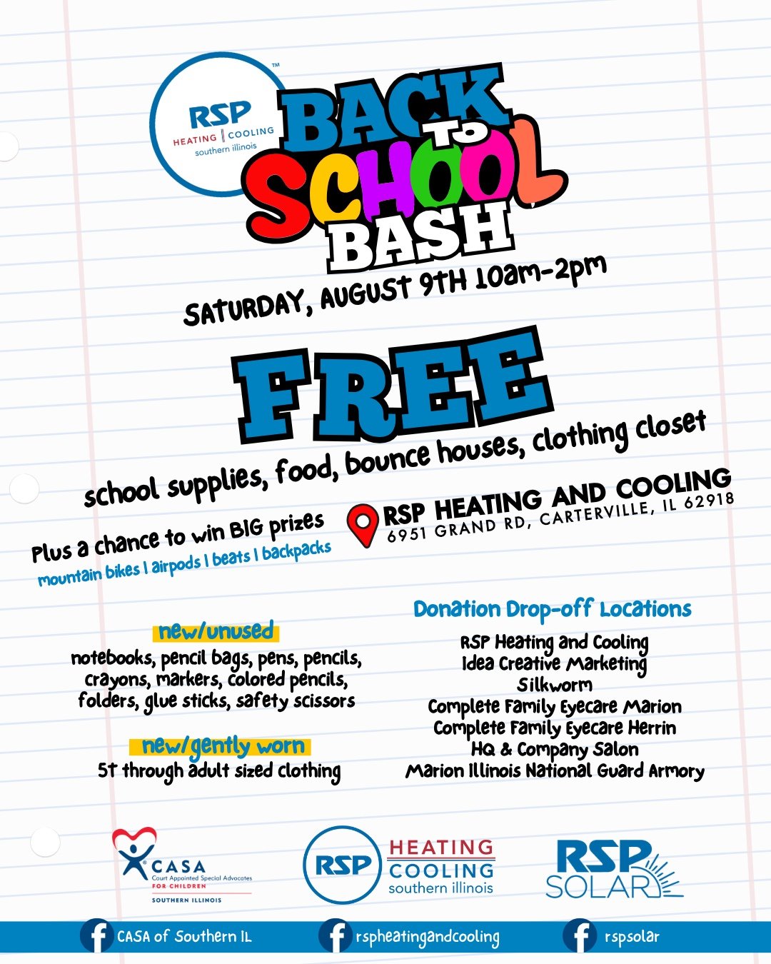 FREE EVENT Saturday August 9th 10am-2pm RSP Heating and Cooling 6951 Grand Rd. Carterville, IL 62918 School supplies, food, bounce houses, & clothing closet!