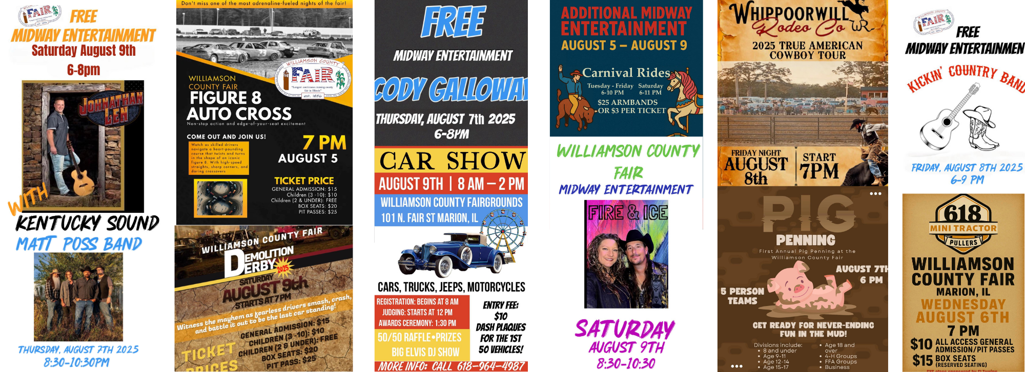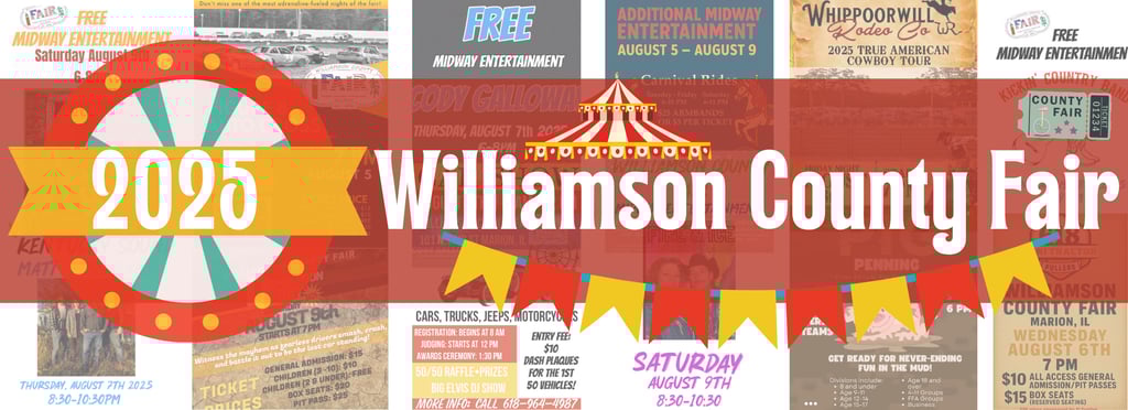 Mark your calendars for August 2-9 in Marion, Illinois!! Our beloved Williamson County fair brings together carnivals, livestock contests, pageants, and high-octane grandstand action- plus live music night after night. Every year just gets better! Get ready to ride, cheer, laugh, and make memories at this 8-day celebration packed with fun for everyone under the fairground lights!